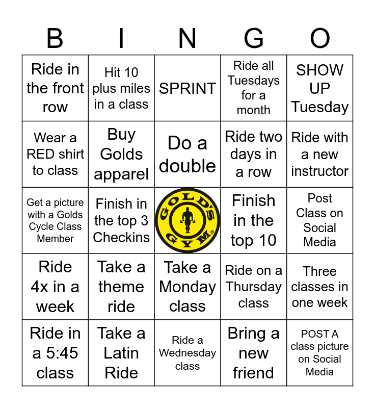 This bingo card has a free space and 24 words: Ride in a 5:45 class, Take a theme ride, Do a double, Bring a new friend, SHOW UP Tuesday, Ride in the front row, Hit 10 plus miles in a class, SPRINT, Finish in the top 10, Post Class on Social Media, Get a picture with a Golds Cycle Class Member, Buy Golds apparel, Ride on a Thursday class, Three classes in one week, Wear a RED shirt to class, Take a Latin Ride, Ride a Wednesday class, Ride all Tuesdays for a month, Ride with a new instructor, Ride 4x in a week, Finish in the top 3 Checkins, Take a Monday class, Ride two days in a row and POST A class picture on Social Media.