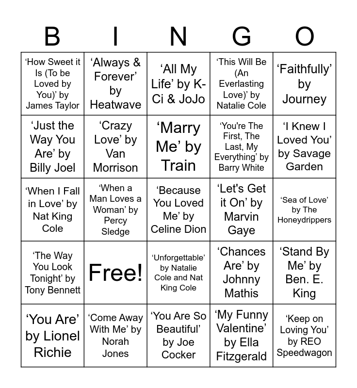This bingo card has 25 words: Free!, ‘You Are So Beautiful’ by Joe Cocker, ‘Marry Me’ by Train, ‘You Are’ by Lionel Richie, ‘Faithfully’ by Journey, ‘How Sweet it Is (To be Loved by You)’ by James Taylor, ‘Just the Way You Are’ by Billy Joel, ‘Always & Forever’ by Heatwave, ‘Let's Get it On’ by Marvin Gaye, ‘Unforgettable’ by Natalie Cole and Nat King Cole, ‘You're The First, The Last, My Everything’ by Barry White, ‘When I Fall in Love’ by Nat King Cole, ‘Chances Are’ by Johnny Mathis, ‘Stand By Me’ by Ben. E. King, ‘Crazy Love’ by Van Morrison, ‘Keep on Loving You’ by REO Speedwagon, ‘Sea of Love’ by The Honeydrippers, ‘All My Life’ by K-Ci & JoJo, ‘I Knew I Loved You’ by Savage Garden, ‘When a Man Loves a Woman’ by Percy Sledge, ‘Because You Loved Me’ by Celine Dion, ‘Come Away With Me’ by Norah Jones, ‘The Way You Look Tonight’ by Tony Bennett, ‘This Will Be (An Everlasting Love)’ by Natalie Cole and ‘My Funny Valentine’ by Ella Fitzgerald.