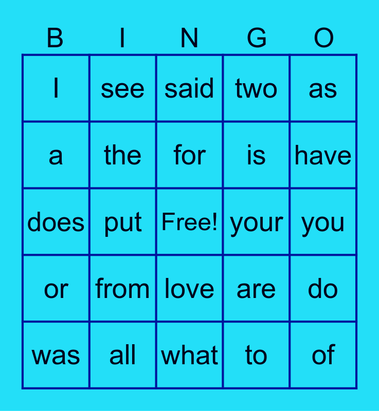 This bingo card has a free space and 24 words: from, all, for, was, as, I, a, see, your, love, is, does, are, do, the, to, you, said, have, put, of, or, two and what.