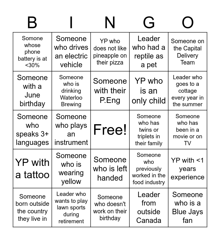 This bingo card has a free space and 28 words: YP with <1 years experience, YP who has visited at least 5 continents, YP who is an only child, Leader from outside Canada, Someone with a June birthday, YP who does not like pineapple on their pizza, Someone who drives an electric vehicle, YP with a tattoo, Someone who has twins or triplets in their family, Someone born outside the country they live in, Someone who speaks 3+ languages, Leader who had a reptile as a pet, Leader who wants to play lawn sports during retirement, Someone who doesn't work on their birthday, Leader who goes to a cottage every year in the summer, Someone who joined GHD during the pandemic, Someone who is wearing yellow, Someone who is drinking Waterloo Brewing, Someone with their P.Eng, Someone who is left handed, Somone whose phone battery is at <30%, Someone who has seen the same movie 10+ times, Someone who is a Blue Jays fan, Someone who plays an instrument, Someone who has been in a movie or on TV, Someone who previously worked in the food industry, Someone on the Capital Delivery Team and Someone on the Operations Team.