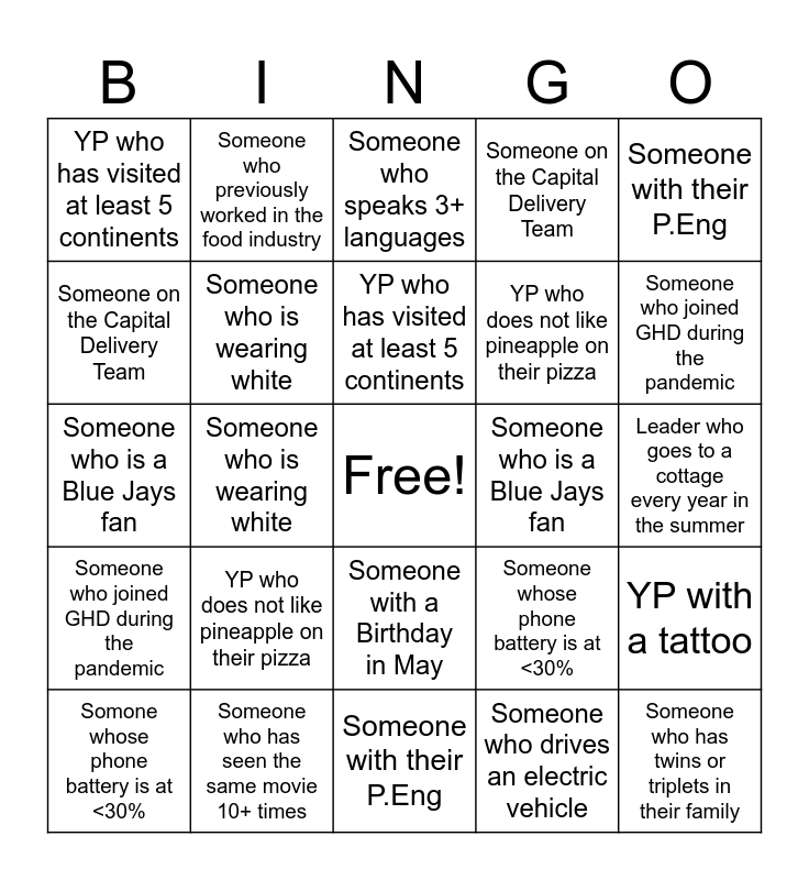 This bingo card has a free space and 42 words: YP with <1 years experience, YP who has visited at least 5 continents, YP who is an only child, YP who does not like pineapple on their pizza, Someone who drives an electric vehicle, YP with a tattoo, Someone who has twins or triplets in their family, Someone born outside the country they live in, Someone who speaks 3+ languages, Someone with a Birthday in May, Leader who goes to a cottage every year in the summer, Someone who joined GHD during the pandemic, Someone who is wearing white, Someone with their P.Eng, Someone who is left handed, Someone whose phone battery is at <30%, Someone who has seen the same movie 10+ times, Someone who is a Blue Jays fan, Someone who plays an instrument, Someone who previously worked in the food industry, Someone on the Capital Delivery Team, Someone on the Operations Team, YP with <1 years experience, YP who has visited at least 5 continents, YP who is an only child, Someone with a May birthday, YP who does not like pineapple on their pizza, Someone who drives an electric vehicle, YP with a tattoo, Someone who has twins or triplets in their family, Someone who speaks 3+ languages, Someone who joined GHD during the pandemic, Someone who is wearing white, Someone with their P.Eng, Someone who is left handed, Somone whose phone battery is at <30%, Someone who has seen the same movie 10+ times, Someone who is a Blue Jays fan, Someone who plays an instrument, Someone who previously worked in the food industry, Someone on the Capital Delivery Team and Someone on the Operations Team.