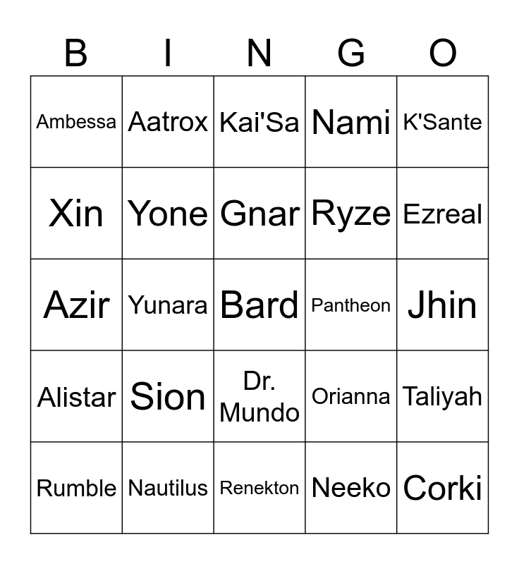 This bingo card has 25 words: Sion, Renekton, Gnar, Rumble, K'Sante, Ambessa, Xin, Aatrox, Pantheon, Dr. Mundo, Ryze, Azir, Orianna, Taliyah, Yone, Corki, Jhin, Kai'Sa, Ezreal, Yunara, Bard, Nautilus, Alistar, Nami and Neeko.
