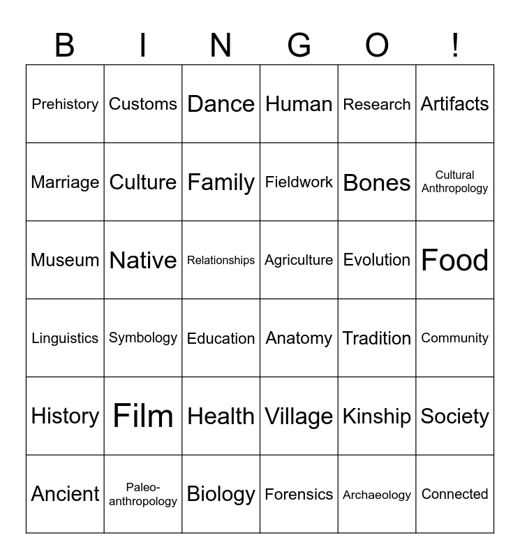 This bingo card has 42 words: Archaeology, Culture, Religion, Evolution, Community, Symbology, Museum, Art, Dance, Food, Relationships, Fieldwork, Cultural Anthropology, Research, Paleo-anthropology, Linguistics, Society, Bones, Connected, Customs, Artifacts, Health, History, Prehistory, Pictograhphs, Ancient, Family, Rituals, Film, Kinship, Science, Agriculture, Marriage, Tradition, Biology, Education, Anatomy, Native, Village, Forensics, Human and World.