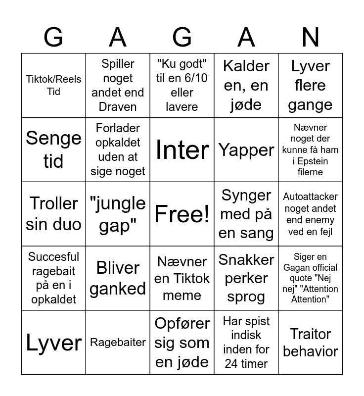 This bingo card has a free space and 24 words: Bliver ganked, Ragebaiter, Inter, Lyver, Lyver flere gange, Tiktok/Reels Tid, Senge tid, Spiller noget andet end Draven, Synger med på en sang, Nævner en Tiktok meme, Yapper, Troller sin duo, Snakker perker sprog, Siger en Gagan official quote "Nej nej" "Attention Attention", Forlader opkaldet uden at sige noget, Har spist indisk inden for 24 timer, Autoattacker noget andet end enemy ved en fejl, "Ku godt" til en 6/10 eller lavere, Nævner noget der kunne få ham i Epstein filerne, "jungle gap", Traitor behavior, Succesful ragebait på en i opkaldet, Kalder en, en jøde and Opfører sig som en jøde.