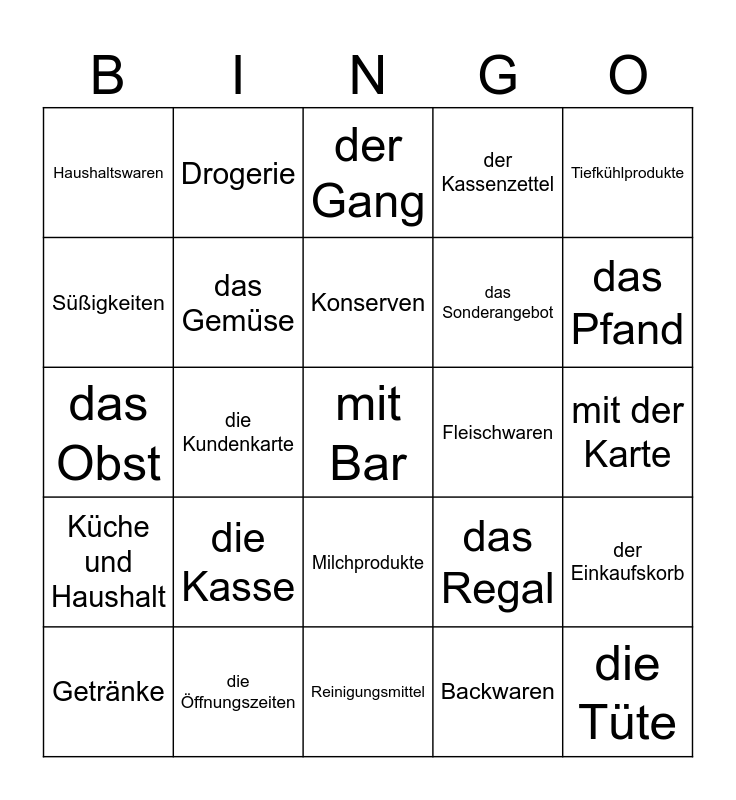 This bingo card has a free space and 24 words: die Kasse, die Öffnungszeiten, Konserven, Getränke, Tiefkühlprodukte, Haushaltswaren, Süßigkeiten, Drogerie, Fleischwaren, Milchprodukte, das Sonderangebot, das Obst, das Regal, der Einkaufskorb, das Gemüse, Backwaren, mit der Karte, der Gang, das Pfand, die Kundenkarte, die Tüte, Küche und Haushalt, der Kassenzettel and Reinigungsmittel.
