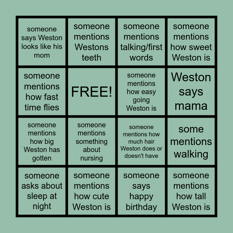 This bingo card has 20 words: some mentions walking, someone says Weston looks like his dad, someone mentions talking/first words, someone says baby, someone asks about sleep at night, someone mentions how fast time flies, someone mentions how cute Weston is, someone says Weston looks like his mom, someone mentions how big Weston has gotten, someone mentions Westons teeth, someone mentions something about nursing, someone mentions how much hair Weston does or doesn't have, FREE!, someone mentions how tall Weston is, someone mentions how easy going Weston is, someone asks about the dog, Weston says mama, someone mentions how sweet Weston is, someone says happy birthday and Weston says dada.