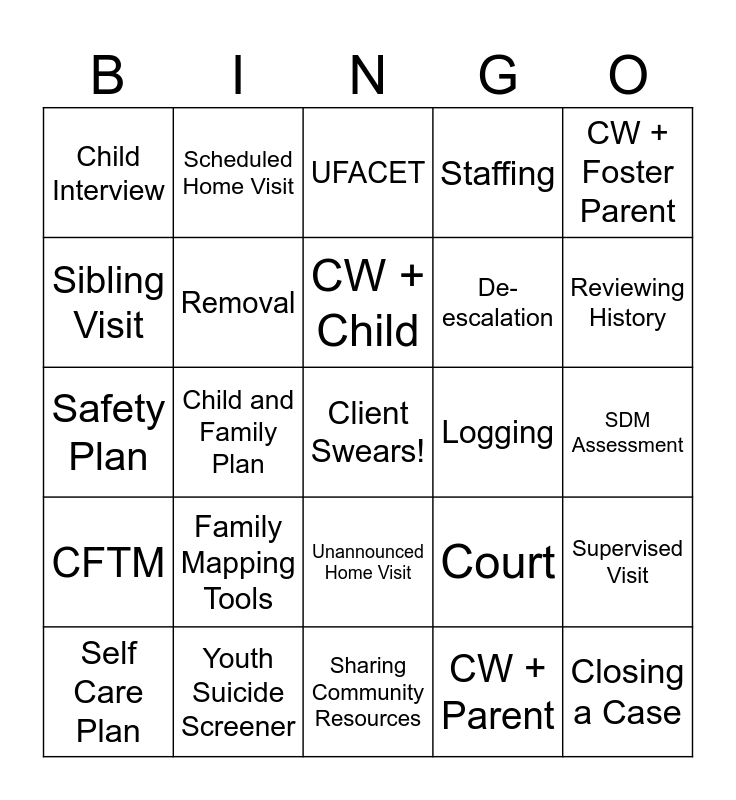 This bingo card has a free space and 24 words: Self Care Plan, Family Mapping Tools, CW + Child, CW + Parent, CW + Foster Parent, Child Interview, Scheduled Home Visit, UFACET, Logging, SDM Assessment, Safety Plan, Removal, Court, Supervised Visit, Sibling Visit, Youth Suicide Screener, Sharing Community Resources, Staffing, Reviewing History, CFTM, Child and Family Plan, Unannounced Home Visit, De-escalation and Closing a Case.
