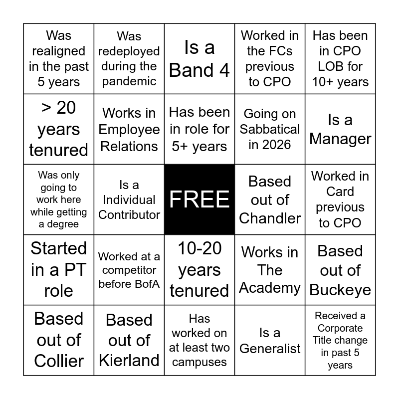 This bingo card has a free space and 24 words: Worked at a competitor before BofA, Based out of Kierland, Has been in role for 5+ years, Based out of Collier, Has been in CPO LOB for 10+ years, Was realigned in the past 5 years, > 20 years tenured, Was redeployed during the pandemic, Based out of Chandler, 10-20 years tenured, Going on Sabbatical in 2026, Was only going to work here while getting a degree, Works in The Academy, Based out of Buckeye, Works in Employee Relations, Is a Generalist, Worked in Card previous to CPO, Is a Band 4, Is a Manager, Is a Individual Contributor, Received a Corporate Title change in past 5 years, Started in a PT role, Worked in the FCs previous to CPO and Has worked on at least two campuses.