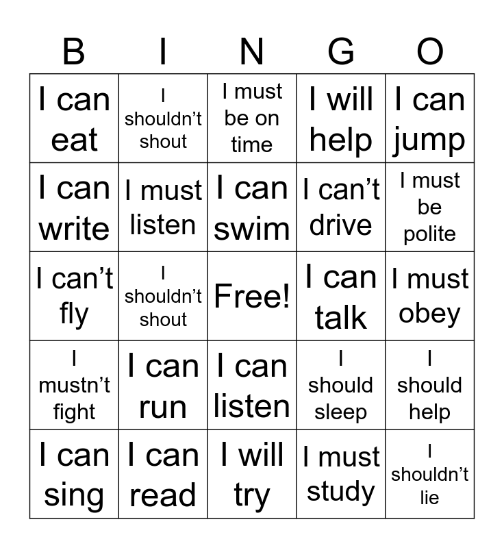 This bingo card has a free space and 24 words: I can run, I can read, I can swim, I can sing, I can jump, I can eat, I can write, I shouldn’t shout, I can talk, I can listen, I can’t drive, I can’t fly, I should sleep, I should help, I must listen, I must study, I must obey, I must be on time, I must be polite, I shouldn’t shout, I shouldn’t lie, I mustn’t fight, I will help and I will try.