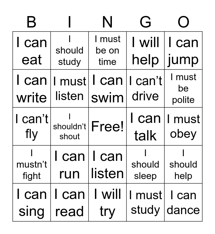 This bingo card has a free space and 24 words: I can run, I can read, I can swim, I can sing, I can jump, I can eat, I can write, I should study, I can talk, I can listen, I can’t drive, I can’t fly, I should sleep, I should help, I must listen, I must study, I must obey, I must be on time, I must be polite, I shouldn’t shout, I can dance, I mustn’t fight, I will help and I will try.