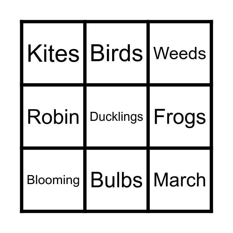 This bingo card has 65 words: Spring, April, May, Tulips, Rain, Baseball, Birds, Blooms, Bulbs, Spring Break, Butterflies, Cherry Blossoms, Daises, Ducklings, Fawns, Frogs, Gardening, Kites, Ladybugs, March, Nest, Peony, Robin, Rabbits, Flowers, Sunshine, Grass, Green, Seeds, Spring Cleaning, Umbrella, Puddles, Trees Shovels, Grow, Planting, Bugs, Earth Day, Chirping, Flying, Buzzing, Blooming, Easter, Crops, Daffodil, Rainbow, Warm, Windy, Storms, Soil, Dandelions, Rosebuds, Plow, Hatch, Tadpole, Picnic, Hiking, Walking, Weeds, Chick, Iris, Nature, Lily, Raincoat, Rhubarb and Watering Can.