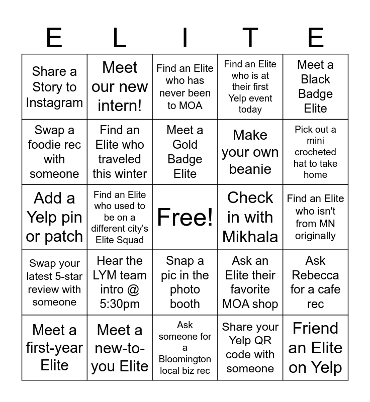This bingo card has a free space and 24 words: Hear the LYM team intro @ 5:30pm, Meet a new-to-you Elite, Meet a Gold Badge Elite, Meet a first-year Elite, Meet a Black Badge Elite, Share a Story to Instagram, Swap a foodie rec with someone, Meet our new intern!, Check in with Mikhala, Snap a pic in the photo booth, Make your own beanie, Add a Yelp pin or patch, Ask an Elite their favorite MOA shop, Ask Rebecca for a cafe rec, Find an Elite who traveled this winter, Share your Yelp QR code with someone, Find an Elite who isn't from MN originally, Find an Elite who has never been to MOA, Pick out a mini crocheted hat to take home, Find an Elite who used to be on a different city's Elite Squad, Friend an Elite on Yelp, Swap your latest 5-star review with someone, Find an Elite who is at their first Yelp event today and Ask someone for a Bloomington local biz rec.
