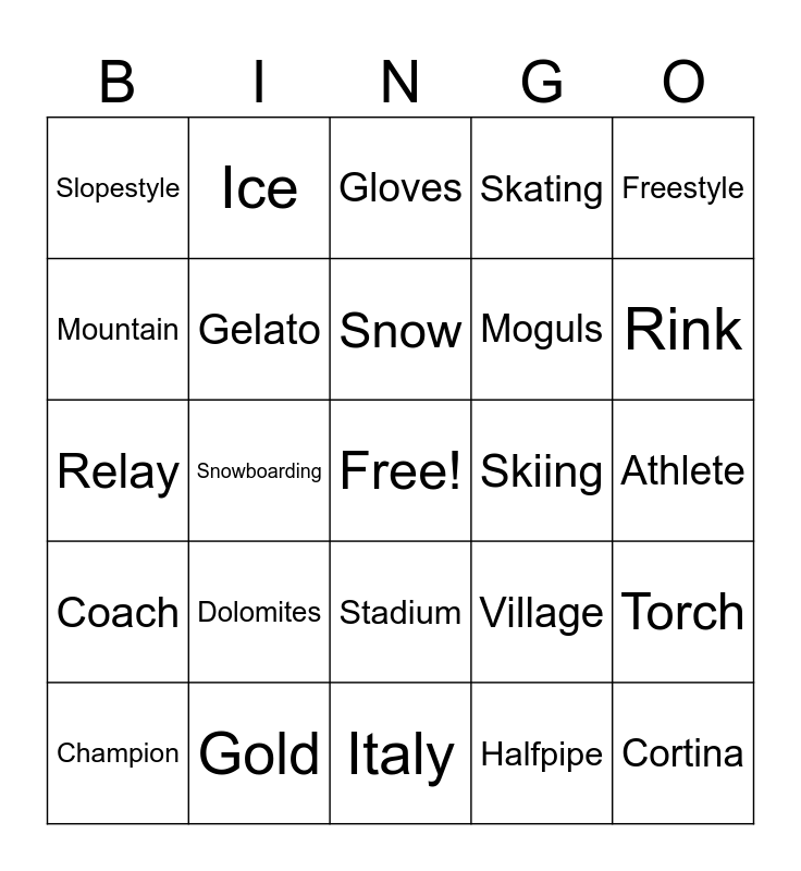 This bingo card has a free space and 52 words: 2026, Cortina, Milan, Italy, Dolomites, arena, Ice, Legacy, Mountain, Pasta, Gelato, Pizza, Torch, Village, Ceremony, Medal, Snow, Skiing, Jumping, Freestyle, Snowboarding, Halfpipe, Slopestyle, Moguls, Slalom, Curling, Figure skating, Hockey, Rink, Blizzard, Sled, Skating, Poles, Helmet, Goggles, Gloves, Gold, Silver, Bronze, Podium, Flame, Athlete, Coach, Judge, Stadium, Flag, Finals, Relay, Timing, Record, Champion and Victory.
