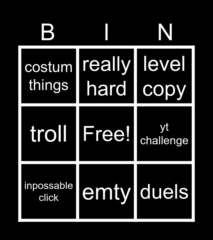 This bingo card has a free space and 11 words: straight fly, swing, yt challenge, inpossable click, level copy, costum things, emty, wave spam, troll, really hard and duels.