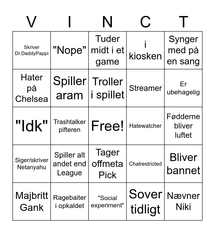 This bingo card has a free space and 24 words: Spiller alt andet end League, Ragebaiter i opkaldet, Troller i spillet, Majbritt Gank, Synger med på en sang, Skriver Dr.DaddyPappi, Hater på Chelsea, "Nope", Hatewatcher, Tager offmeta Pick, Streamer, "Idk", Chatrestricted, Bliver bannet, Spiller aram, Sover tidligt, Fødderne bliver luftet, Tuder midt i et game, Er ubehagelig, Trashtalker pifteren, Nævner Niki, Siger/skriver Netanyahu, i kiosken and "Social experiment".
