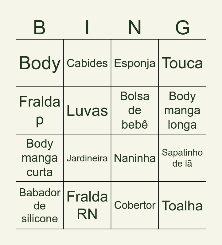 This bingo card has 98 words: Berço, Manta, Lençol, Cobertor, Travesseiro, Mosquiteiro, Protetor de berço, Trocador, Moisés, Móbile, Abajur, Cortina, Tapete, Cesto de roupas, Organizador, Cabides, Naninha, Fralda de pano, Cueiro, Almofada de amamentação, Babá eletrônica, Ursinho, Almofada, Kit berço, Enxoval, Body, Macacão, Culote, Mijão, Meias, Sapatinho, Luvas, Gorrinho, Babador, Jardineira, Casaquinho, Touca, Fralda de boca, Sapatinho de lã, Tênis, Sapatinho de pano, Body manga longa, Body manga curta, Roupa de sair, Culote com pé, Pagão, Fralda de ombro, Babador bandana, Sandalinha, Fralda descartável, Lenço umedecido, Pomada, Sabonete, Shampoo, Condicionador, Banheira, Toalha, Toalha fralda, Escova, Pente, Cortador de unha, Tesourinha, Aspirador nasal, Termômetro, Algodão, Creme assadura, Talco, Loção, Saboneteira, Organizador de banho, Esponja, Kit Higiene, Mamadeira, Chupeta, Chuquinha, Escova de mamadeira, Colher, Pratinho, Copinho, Babador de silicone, Esterilizador, Bolsa de bebê, Mochila, Canguru, Mordedor, Chocalho, Livro de pano, Almofada de banho, Almofada de amamentação, Cinta pós-parto, Colher térmica, Troninho, Tapete musical, Massageador de gengiva, Fralda RN, Fralda M, Fralda p and Fralda XG.