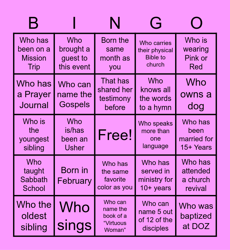 This bingo card has a free space and 24 words: Born in February, Who sings, That has shared her testimony before, Who the oldest sibling, Who is wearing Pink or Red, Who has been on a Mission Trip, Who has a Prayer Journal, Who brought a guest to this event, Who speaks more than one language, Who has the same favorite color as you, Who knows all the words to a hymn, Who is the youngest sibling, Who has served in ministry for 10+ years, Who has attended a church revival, Who can name the Gospels, Who can name 5 out of 12 of the disciples, Who has been married for 15+ Years, Born the same month as you, Who owns a dog, Who is/has been an Usher, Who was baptized at DOZ, Who taught Sabbath School, Who carries their physical Bible to church and Who can name the book of a “Virtuous Woman”.