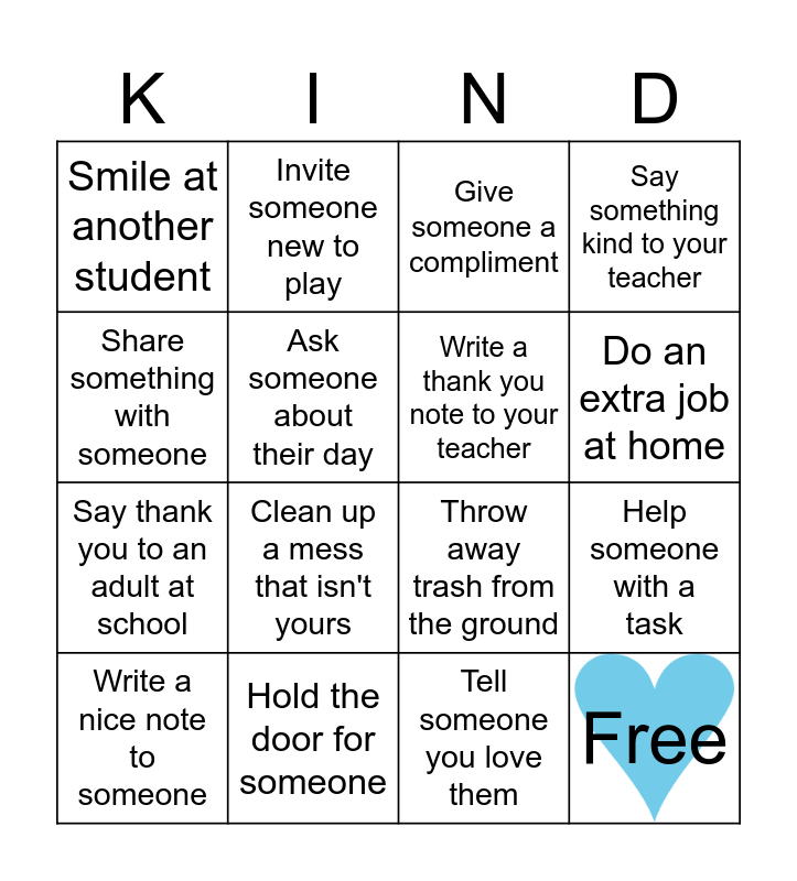 This bingo card has 1 images and 16 words: Hold the door for someone, Help someone with a task, Give someone a compliment, Smile at another student, Say thank you to an adult at school, Invite someone new to play, Throw away trash from the ground, Tell someone you love them, Share something with someone, Ask someone about their day, Write a nice note to someone, Say something kind to your teacher, Clean up a mess that isn't yours, Do an extra job at home, Write a thank you note to your teacher and Free.