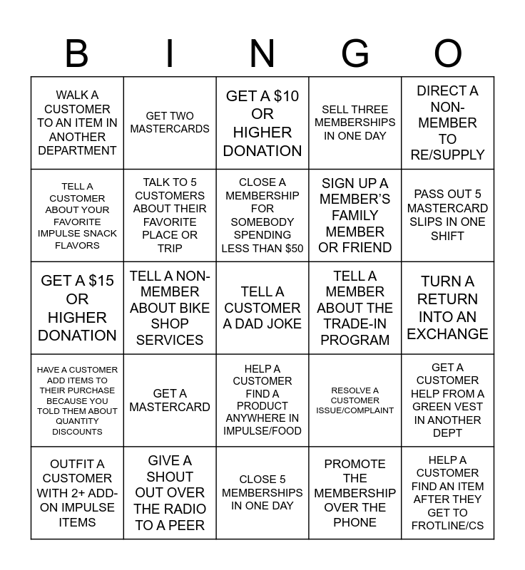 This bingo card has a free space and 24 words: GET A MASTERCARD, GIVE A SHOUT OUT OVER THE RADIO TO A PEER, CLOSE A MEMBERSHIP FOR SOMEBODY SPENDING LESS THAN $50, OUTFIT A CUSTOMER WITH 2+ ADD-ON IMPULSE ITEMS, DIRECT A NON-MEMBER TO RE/SUPPLY, WALK A CUSTOMER TO AN ITEM IN ANOTHER DEPARTMENT, TELL A CUSTOMER ABOUT YOUR FAVORITE IMPULSE SNACK FLAVORS, GET TWO MASTERCARDS, TELL A MEMBER ABOUT THE TRADE-IN PROGRAM, HELP A CUSTOMER FIND A PRODUCT ANYWHERE IN IMPULSE/FOOD, SIGN UP A MEMBER’S FAMILY MEMBER OR FRIEND, GET A $15 OR HIGHER DONATION, RESOLVE A CUSTOMER ISSUE/COMPLAINT, GET A CUSTOMER HELP FROM A GREEN VEST IN ANOTHER DEPT, TALK TO 5 CUSTOMERS ABOUT THEIR FAVORITE PLACE OR TRIP, PROMOTE THE MEMBERSHIP OVER THE PHONE, TURN A RETURN INTO AN EXCHANGE, GET A $10 OR HIGHER DONATION, PASS OUT 5 MASTERCARD SLIPS IN ONE SHIFT, TELL A NON-MEMBER ABOUT BIKE SHOP SERVICES, HELP A CUSTOMER FIND AN ITEM AFTER THEY GET TO FROTLINE/CS, HAVE A CUSTOMER ADD ITEMS TO THEIR PURCHASE BECAUSE YOU TOLD THEM ABOUT QUANTITY DISCOUNTS, SELL THREE MEMBERSHIPS IN ONE DAY and CLOSE 5 MEMBERSHIPS IN ONE DAY.