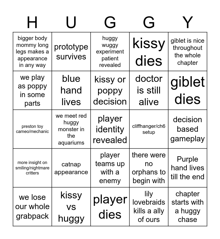 This bingo card has 25 words: catnap appearance, player dies, kissy or poppy decision, we lose our whole grabpack, giblet is nice throughout the whole chapter, bigger body mommy long legs makes a appearance in any way, we play as poppy in some parts, prototype survives, cliffhanger/ch6 setup, player teams up with a enemy, doctor is still alive, preston toy cameo/mechanic, there were no orphans to begin with, Purple hand lives till the end, blue hand lives, chapter starts with a huggy chase, decision based gameplay, huggy wuggy experiment patient revealed, giblet dies, we meet red huggy monster in the aquariums, player identity revealed, kissy vs huggy, more insight on smiling/nightmare critters, kissy dies and lily lovebraids kills a ally of ours.