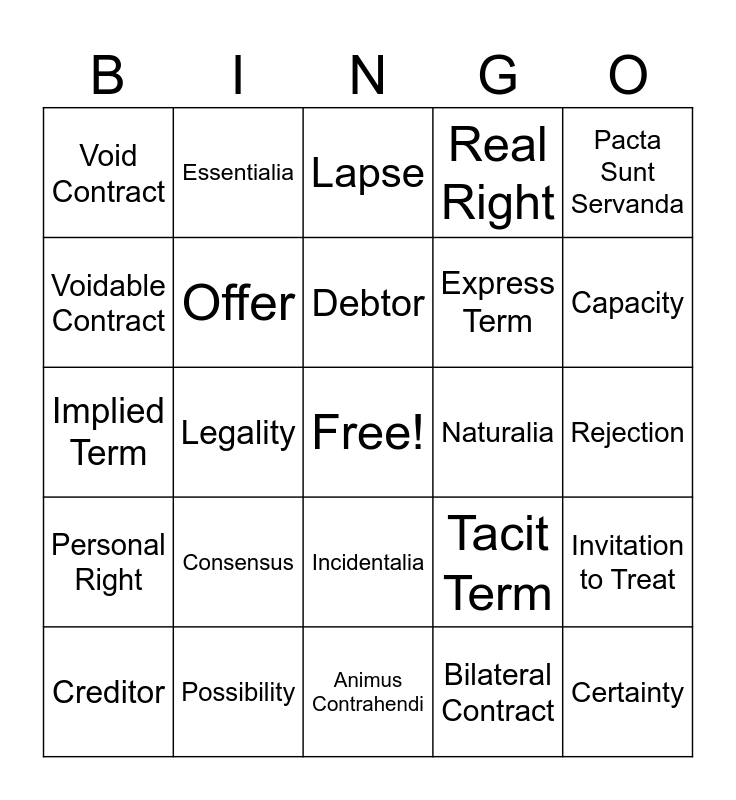 This bingo card has a free space and 25 words: Consensus, Animus Contrahendi, Debtor, Creditor, Pacta Sunt Servanda, Void Contract, Voidable Contract, Essentialia, Naturalia, Incidentalia, Express Term, Implied Term, Tacit Term, Invitation to Treat, Offer, Revocation, Rejection, Lapse, Capacity, Legality, Certainty, Possibility, Personal Right, Real Right and Bilateral Contract.