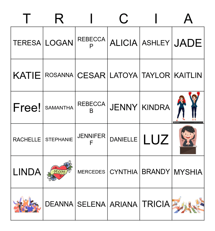 This bingo card has 5 images and 31 words: CYNTHIA, MERCEDES, ARIANA, KATIE, RACHELLE, JENNY, ROSANNA, SELENA, ASHLEY, BRANDY, KAITLIN, ALICIA, MYSHIA, SAMANTHA, LATOYA, TERESA, LINDA, KINDRA, Free!, REBECCA P, REBECCA B, STEPHANIE, DANIELLE, JENNIFER F, LUZ, LOGAN, TAYLOR, DEANNA, CESAR, JADE and TRICIA.