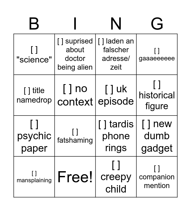 This bingo card has 21 words: Free!, [ ] dalek, [ ] suprised about doctor being alien, [ ] self sacrifice, [ ] creepy child, [ ] uk episode, [ ] "science", [ ] laden an falscher adresse/ zeit, [ ] tardis phone rings, [ ] historical figure, [ ] psychic paper, [ ] gaaaeeeeee, [ ] companion mention, [ ] deos ex machina, [ ] no context, [ ] impersonating, [ ] mansplaining, [ ] fatshaming, [ ] title namedrop, [ ] new dumb gadget and [ ] creepy Lovestory.
