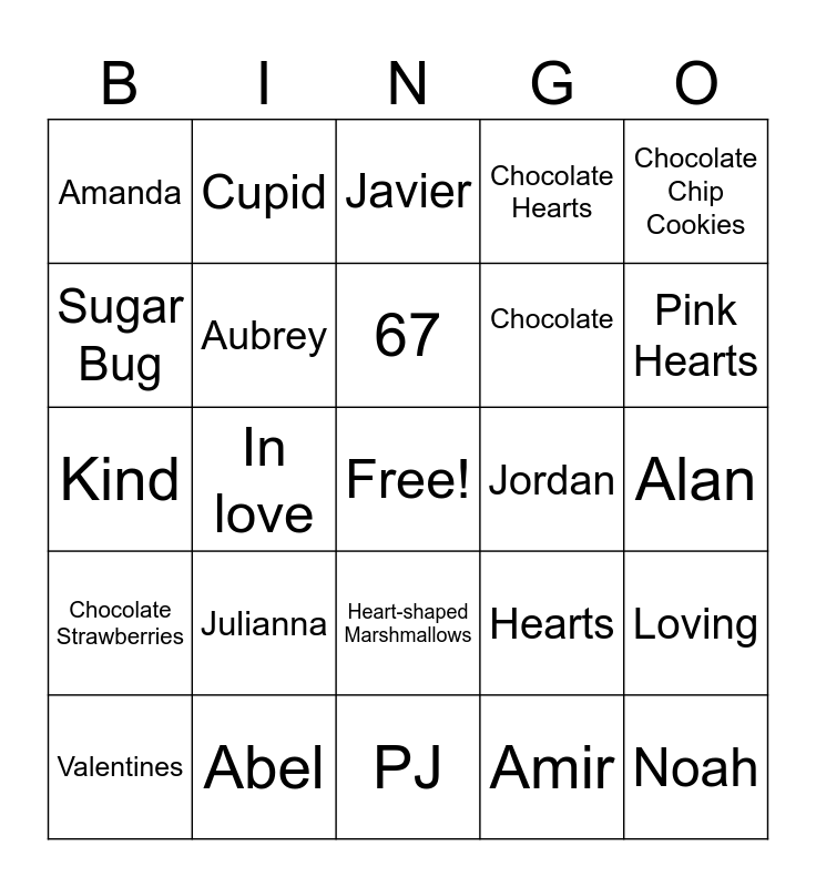 This bingo card has a free space and 29 words: Valentines, Flowers, In love, Julio, Amanda, Javier, Aubrey, Julianna, Jordan, Abel, Alan, Noah, PJ, Amir, Pink Hearts, Chocolate Marshmallows, Heart-shaped Marshmallows, Chocolate Strawberries, Chocolate Chip Cookies, Kind, Hearts, Hugs and Kisses, Chocolate, Sugar Bug, Chocolate Hearts, Cupid, Loving, 67 and Heart Cookies.