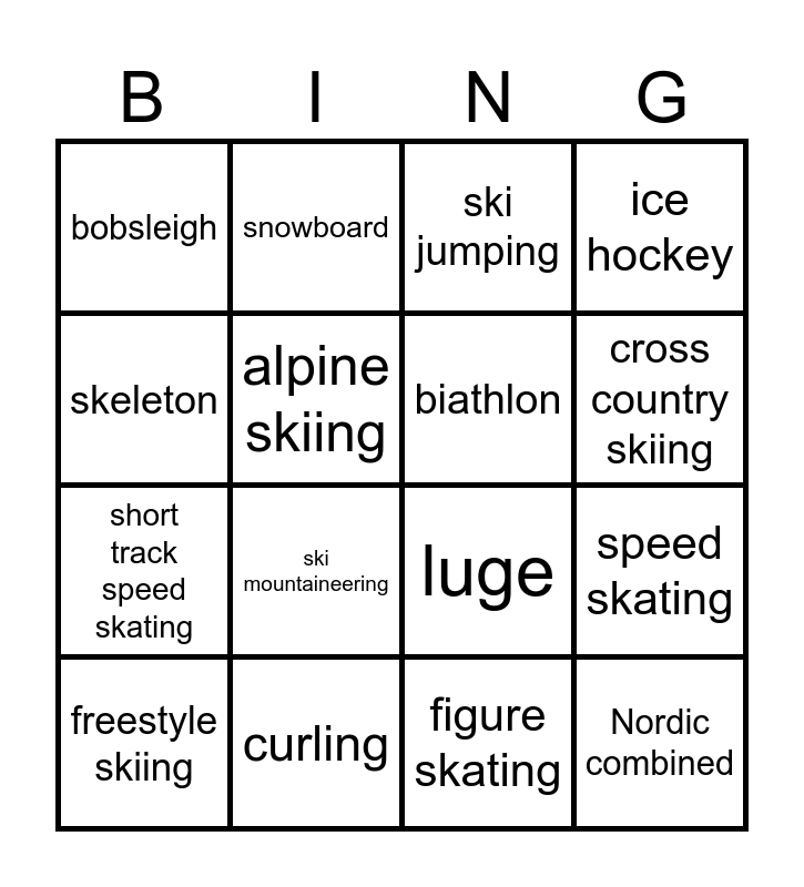 This bingo card has 16 words: curling, speed skating, ski jumping, bobsleigh, short track speed skating, snowboard, luge, figure skating, skeleton, alpine skiing, freestyle skiing, ice hockey, ski mountaineering, cross country skiing, biathlon and Nordic combined.