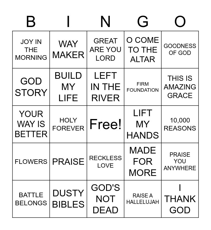 This bingo card has a free space and 24 words: PRAISE, DUSTY BIBLES, LEFT IN THE RIVER, BATTLE BELONGS, GOODNESS OF GOD, JOY IN THE MORNING, GOD STORY, WAY MAKER, LIFT MY HANDS, RECKLESS LOVE, FIRM FOUNDATION, YOUR WAY IS BETTER, MADE FOR MORE, PRAISE YOU ANYWHERE, BUILD MY LIFE, RAISE A HALLELUJAH, 10,000 REASONS, GREAT ARE YOU LORD, THIS IS AMAZING GRACE, HOLY FOREVER, I THANK GOD, FLOWERS, O COME TO THE ALTAR and GOD'S NOT DEAD.