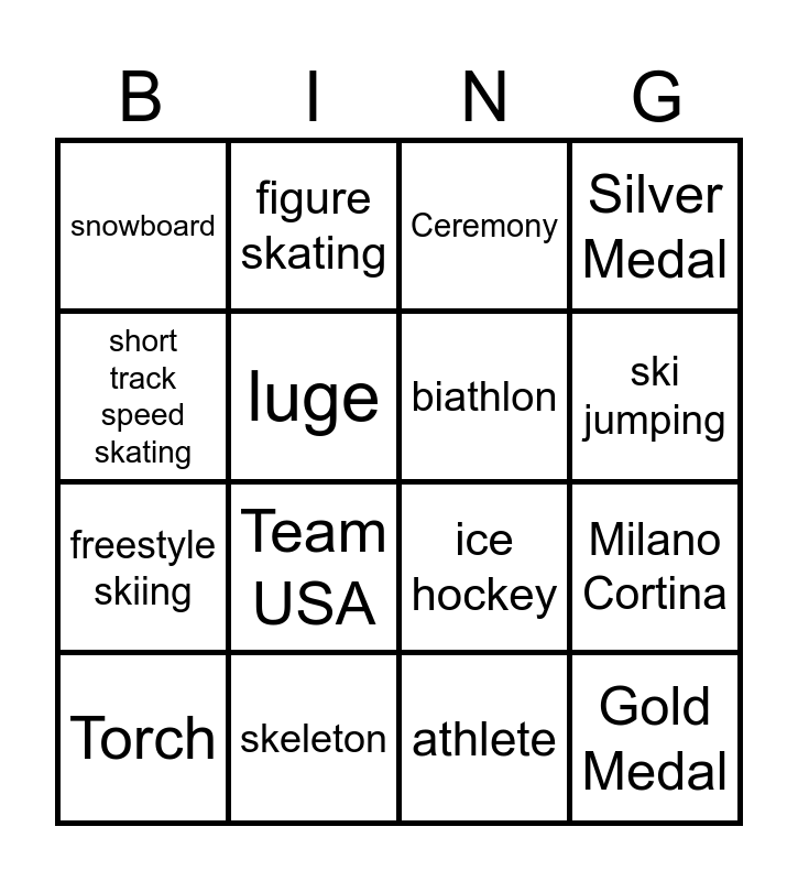 This bingo card has 24 words: curling, speed skating, ski jumping, bobsleigh, short track speed skating, snowboard, luge, figure skating, skeleton, alpine skiing, freestyle skiing, ice hockey, ski mountaineering, cross country skiing, biathlon, Nordic combined, athlete, Ceremony, Team USA, Milano Cortina, Torch, Gold Medal, Silver Medal and Bronze Medal.