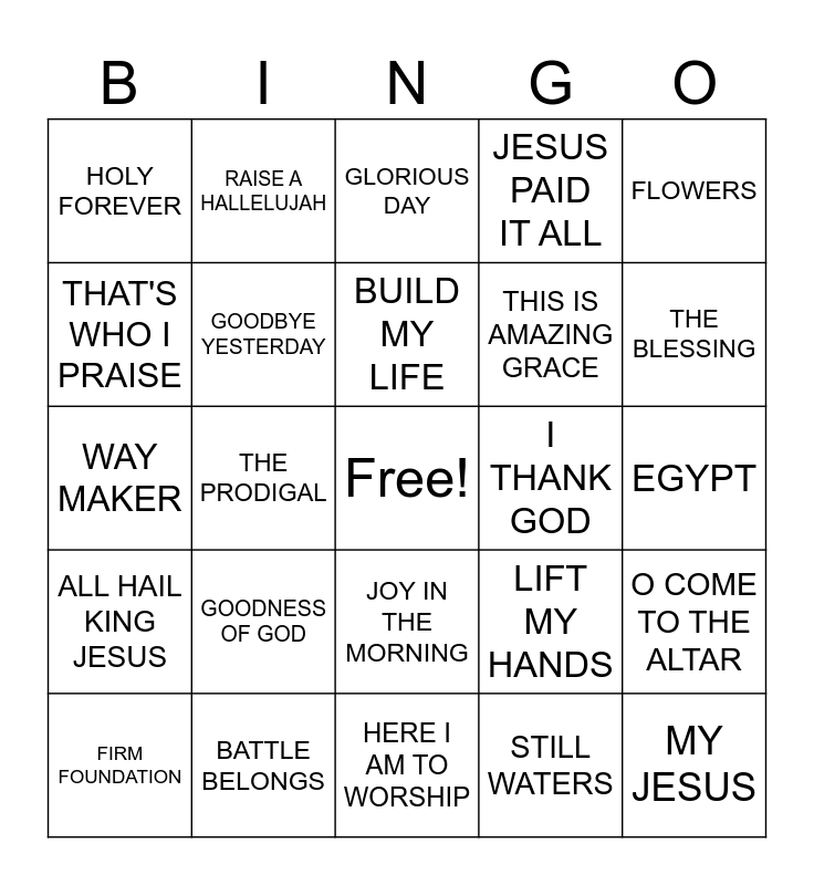 This bingo card has a free space and 24 words: GOODNESS OF GOD, BATTLE BELONGS, BUILD MY LIFE, FIRM FOUNDATION, FLOWERS, HOLY FOREVER, THAT'S WHO I PRAISE, RAISE A HALLELUJAH, I THANK GOD, JOY IN THE MORNING, THIS IS AMAZING GRACE, WAY MAKER, LIFT MY HANDS, O COME TO THE ALTAR, GOODBYE YESTERDAY, STILL WATERS, EGYPT, GLORIOUS DAY, THE BLESSING, THE PRODIGAL, MY JESUS, ALL HAIL KING JESUS, JESUS PAID IT ALL and HERE I AM TO WORSHIP.