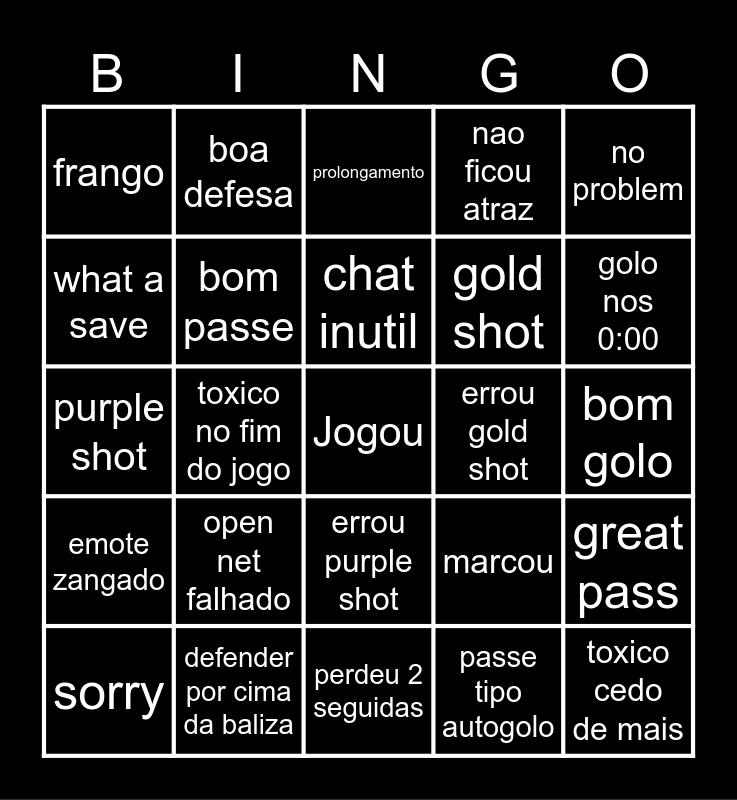 This bingo card has a free space and 24 words: open net falhado, defender por cima da baliza, chat inutil, sorry, no problem, frango, what a save, boa defesa, errou gold shot, errou purple shot, gold shot, purple shot, marcou, great pass, bom passe, passe tipo autogolo, bom golo, prolongamento, golo nos 0:00, toxico no fim do jogo, toxico cedo de mais, emote zangado, nao ficou atraz and perdeu 2 seguidas.