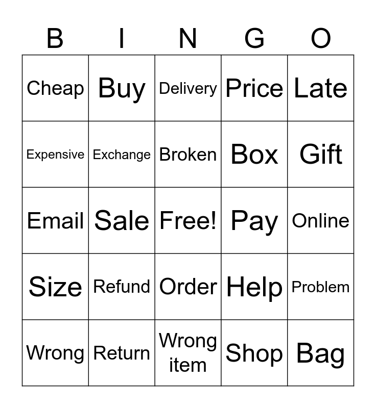 This bingo card has a free space and 24 words: Refund, Return, Broken, Wrong, Late, Cheap, Expensive, Buy, Pay, Order, Box, Email, Help, Problem, Exchange, Shop, Online, Delivery, Gift, Sale, Bag, Size, Price and Wrong item.