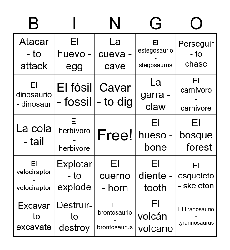 This bingo card has a free space and 24 words: Explotar - to explode, Destruir- to destroy, Cavar - to dig, Excavar - to excavate, Perseguir - to chase, Atacar - to attack, El dinosaurio - dinosaur, El huevo - egg, El hueso - bone, El cuerno - horn, La garra - claw, La cola - tail, El diente - tooth, El esqueleto - skeleton, El fósil - fossil, El volcán - volcano, El bosque - forest, La cueva - cave, El carnívoro - carnivore, El herbívoro - herbivore, El tiranosaurio - tyrannosaurus, El velociraptor - velociraptor, El estegosaurio - stegosaurus and El brontosaurio - brontosaurus.