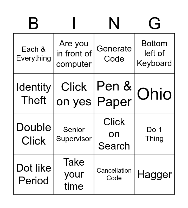 This bingo card has 16 words: Take your time, Do 1 Thing, Generate Code, Each & Everything, Double Click, Are you in front of computer, Click on Search, Cancellation Code, Identity Theft, Click on yes, Dot like Period, Bottom left of Keyboard, Senior Supervisor, Ohio, Pen & Paper and Hagger.