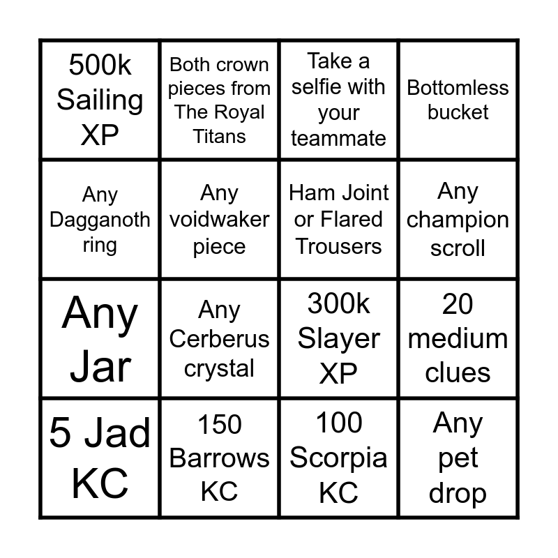 This bingo card has 16 words: 150 Barrows KC, 20 medium clues, Take a selfie with your teammate, 500k Sailing XP, Any Jar, Both crown pieces from The Royal Titans, 300k Slayer XP, 100 Scorpia KC, Any Dagganoth ring, Any voidwaker piece, 5 Jad KC, Bottomless bucket, Any Cerberus crystal, Any champion scroll, Ham Joint or Flared Trousers and Any pet drop.