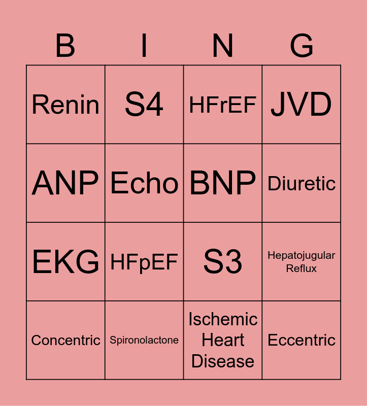 This bingo card has 16 words: Spironolactone, Hepatojugular Reflux, HFrEF, Renin, EKG, S4, S3, Ischemic Heart Disease, ANP, Echo, Concentric, JVD, HFpEF, Diuretic, BNP and Eccentric.