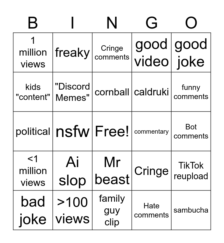 This bingo card has a free space and 24 words: Ai slop, >100 views, cornball, bad joke, good joke, 1 million views, kids "content", freaky, commentary, Mr beast, caldruki, political, Cringe, TikTok reupload, "Discord Memes", Hate comments, Bot comments, Cringe comments, funny comments, nsfw, sambucha, <1 million views, good video and family guy clip.
