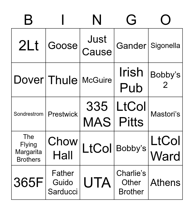 This bingo card has a free space and 75 words: Team spirit, Grenada, Just Cause, Desert Storm/shiel/calm, Reforged, Snow blow, Red flag, Maple Flag, Volant Rodeo, OEF, Rhein Main, Lanes, McGuire, Dover, Mildenhall, Prestwick, Torrejon, Athens, Incirlik, Sigonella, Naples, Sondrestrom, Thule, Goose, Gander, Chesterfield inn, VFW, Three Brothers, Schnitzelhaus, Vesuvius Room, Sachsenhausen, Zeppelinheim, Golden Apple, Bobby’s, Bobby’s 2, Irish Pub, Fish and Chips/Mildenhall, Top of the World Club, Mastori’s, Charlie’s Other Brother, 153,352, 325,000, 344,000, 3000+-150, 218,725, 781, 365F, 2Lt, ChiefMSGT, MSGT, TSGT, LtCol, Pilot, Navigator, Flight Engineer, Loadmaster, Flight Nurse, Flight Doc, Crew Chief, MX, Chow Hall, Inflight Kitchen, Command Post, LtCol Barrett, LtCol Reilly, LtCol Pitts, LtCol Crigler, LtCol Edwards, LtCol Pero, LtCol Ward, The Flying Margarita Brothers, Father Guido Sarducci, Double AFTPs, UTA and Annual Tour.