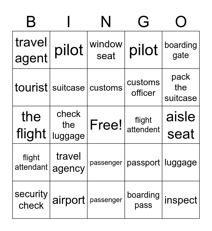This bingo card has a free space and 24 words: travel agency, airport, customs, security check, boarding gate, travel agent, tourist, pilot, flight attendent, passenger, customs officer, the flight, passport, luggage, suitcase, boarding pass, aisle seat, window seat, pack the suitcase, check the luggage, inspect, flight attendant, pilot and passenger.