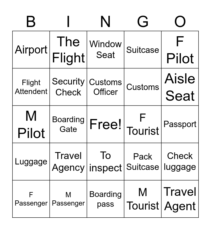 This bingo card has a free space and 24 words: Travel Agency, M Passenger, Customs Officer, F Passenger, F Pilot, Airport, Flight Attendent, The Flight, F Tourist, To inspect, Customs, M Pilot, Pack Suitcase, Check luggage, Security Check, M Tourist, Passport, Window Seat, Aisle Seat, Boarding Gate, Travel Agent, Luggage, Suitcase and Boarding pass.