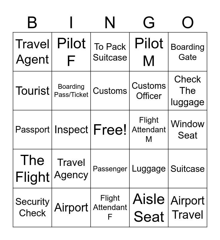 This bingo card has a free space and 24 words: Travel Agency, Airport, Customs, Security Check, Boarding Gate, Travel Agent, Tourist, Pilot F, Flight Attendant M, Passenger, Customs Officer, Passport, Luggage, Suitcase, Boarding Pass/Ticket, Aisle Seat, Window Seat, To Pack Suitcase, Check The luggage, Inspect, Airport Travel, The Flight, Pilot M and Flight Attendant F.
