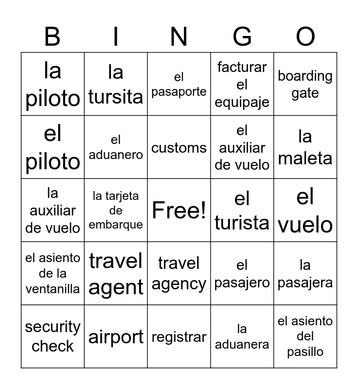 This bingo card has a free space and 24 words: travel agent, airport, customs, security check, boarding gate, la piloto, el piloto, la tursita, el turista, travel agency, el auxiliar de vuelo, la auxiliar de vuelo, el pasajero, la pasajera, el aduanero, la aduanera, el vuelo, el pasaporte, la maleta, la tarjeta de embarque, el asiento del pasillo, el asiento de la ventanilla, facturar el equipaje and registrar.