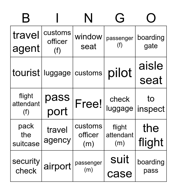 This bingo card has a free space and 24 words: travel agency, airport, customs, security check, boarding gate, travel agent, tourist, customs officer (f), check luggage, customs officer (m), pilot, flight attendant (f), flight attendant (m), the flight, luggage, suit case, to inspect, window seat, aisle seat, pass port, boarding pass, pack the suitcase, passenger (f) and passenger (m).