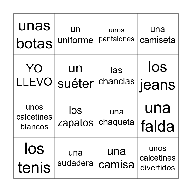 This bingo card has 16 words: una sudadera, una falda, unos pantalones, unas botas, unos calcetines blancos, un uniforme, una chaqueta, una camisa, YO LLEVO, un suéter, los tenis, una camiseta, los zapatos, los jeans, las chanclas and unos calcetines divertidos.