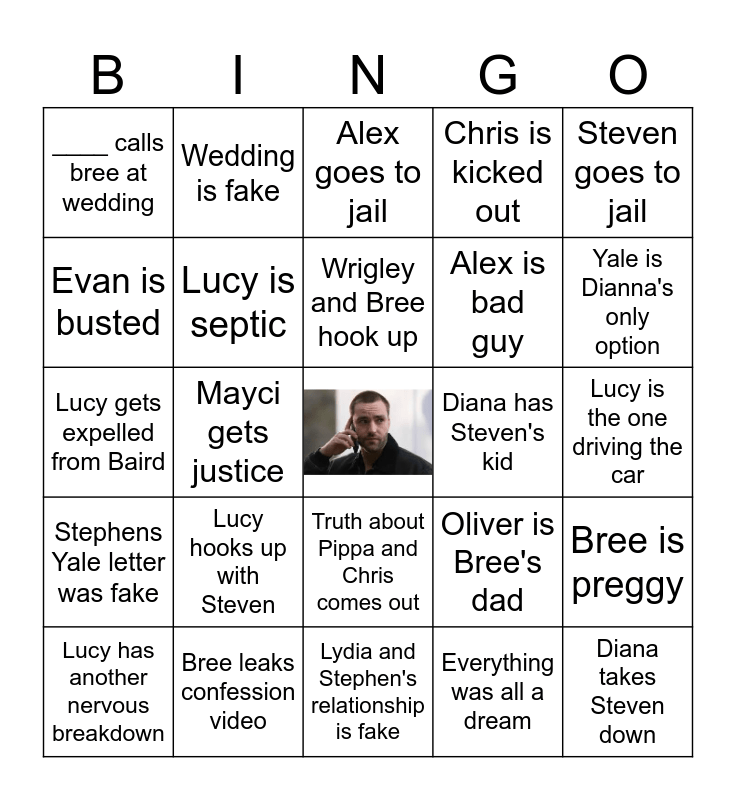 This bingo card has a free space and 24 words: Lucy hooks up with Steven, Bree leaks confession video, Wrigley and Bree hook up, Lucy has another nervous breakdown, Steven goes to jail, ____ calls bree at wedding, Evan is busted, Wedding is fake, Diana has Steven's kid, Truth about Pippa and Chris comes out, Alex is bad guy, Lucy gets expelled from Baird, Oliver is Bree's dad, Bree is preggy, Lucy is septic, Everything was all a dream, Lucy is the one driving the car, Alex goes to jail, Yale is Dianna's only option, Mayci gets justice, Diana takes Steven down, Stephens Yale letter was fake, Chris is kicked out and Lydia and Stephen's relationship is fake.