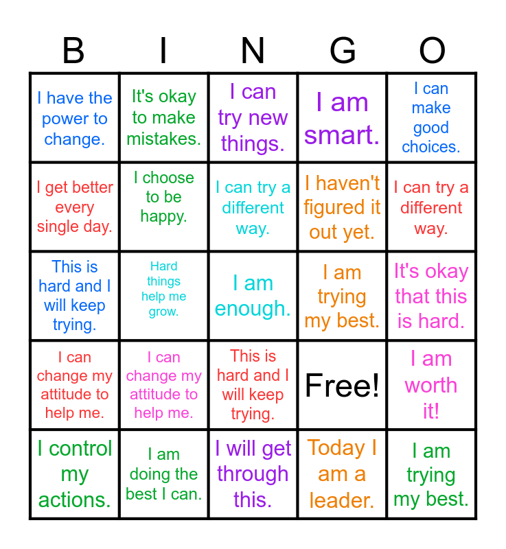 This bingo card has 25 words: I can change my attitude to help me., I will get through this., I can try a different way., I control my actions., I can make good choices., I have the power to change., I get better every single day., It's okay to make mistakes., I am trying my best., This is hard and I will keep trying., I haven't figured it out yet., This is hard and I will keep trying., Free!, I am worth it!, I choose to be happy., I am trying my best., It's okay that this is hard., I can try new things., I can try a different way., Hard things help me grow., I am enough., I am doing the best I can., I can change my attitude to help me., I am smart. and Today I am a leader..