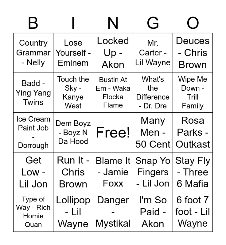 This bingo card has a free space and 44 words: Confessions pt 2 - Usher, 6 foot 7 foot - Lil Wayne, Excuse Me Miss - Jay Z, Type of Way - Rich Homie Quan, Bartender - T-Pain, I'm So Paid - Akon, Locked Up - Akon, Mirror - Lil Wayne, Deuces - Chris Brown, Lollipop - Lil Wayne, Mr. Carter - Lil Wayne, Many Men - 50 Cent, Blame It - Jamie Foxx, Run It - Chris Brown, No Love - Eminem, Danger - Mystikal, Bring Em Out - TI, Ice Cream Paint Job - Dorrough, Freek-a-Leek - Petey Pablo, Wipe Me Down - Trill Family, Lose Yourself - Eminem, We Takin Over - DJ Khaled, Ridin - Chamillionaire, Country Grammar - Nelly, Lemonade - Gucci Mane, Rosa Parks - Outkast, In Da Club - 50 Cent, Grillz - Nelly, Snap Yo Fingers - Lil Jon, Get Low - Lil Jon, No Lie - 2 Chainz, Stay Fly - Three 6 Mafia, Yeah! - Usher, Poppin Then Things - G-Unit, Dem Boyz - Boyz N Da Hood, Lean Back - Fat Joe, Put On - Young Jeezy, A Milli - Lil Wayne, Bustin At Em - Waka Flocka Flame, Badd - Ying Yang Twins, What's the Difference - Dr. Dre, Teach Me How to Dougie - Cali Swag District, Touch the Sky - Kanye West and Ride Wit Me - Nelly.