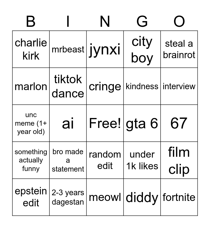 This bingo card has a free space and 24 words: epstein edit, bro made a statement, cringe, diddy, steal a brainrot, charlie kirk, mrbeast, jynxi, gta 6, 67, unc meme (1+ year old), tiktok dance, under 1k likes, film clip, marlon, 2-3 years dagestan, meowl, city boy, interview, something actually funny, ai, random edit, kindness and fortnite.